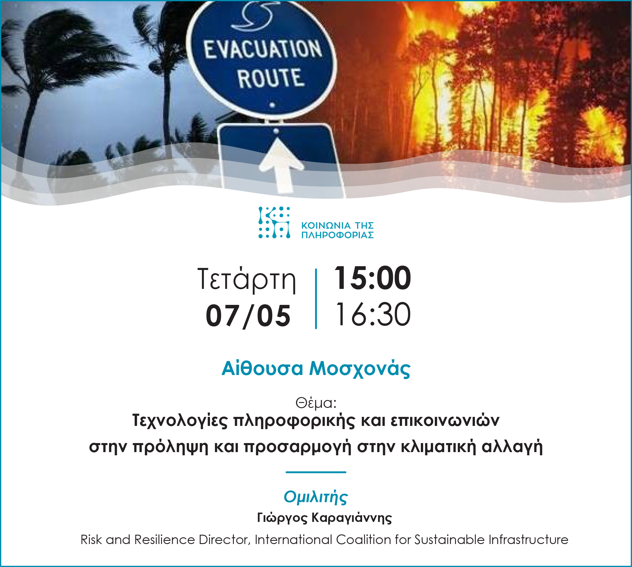 Στην ΚτΠ τον Μάιο πραγματοποιήθηκε ομιλία από τον κο Κραγιάννη Risk and Resilience Director, International Coalition for Sustainable Risk and Resilience Director, International Coalition for Sustainable με θέμα “Τεχνολογίες πληροφορικής και επικοινωνιών στην πρόληψη και προσαρμογή στην κλιματική αλλαγη”.