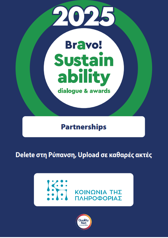 Η Κοινωνία της Πληροφορίας συμμετείχε με τη δράση «Delete στη Ρύπανση, Upload στις Καθαρές Ακτές» στα Bravo Sustainability Dialogue & Awards 2025, που διοργανώνει για 16η συνεχή χρονιά το QualityNet Foundation, παρουσιάζοντας Πρωτοβουλίες που φέρνουν την αλλαγή και υπηρετούν ένα βιώσιμο μέλλον.