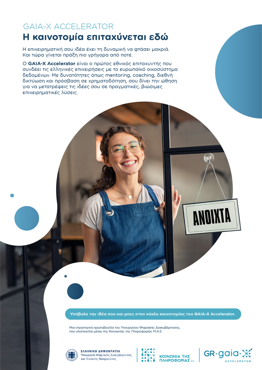 The Greek Hub for Small and Medium-sized Enterprises GAIA‑X Accelerator is a reality, enabling SMEs, startups, business groups, academic and institutional bodies to enter dynamically into the European data ecosystem.